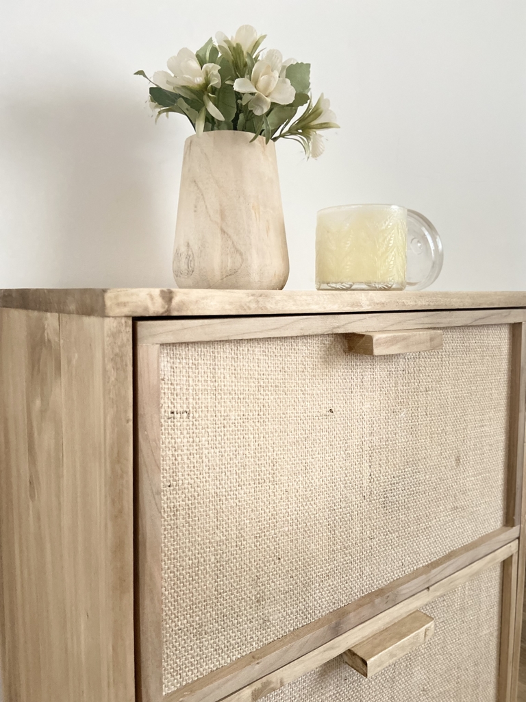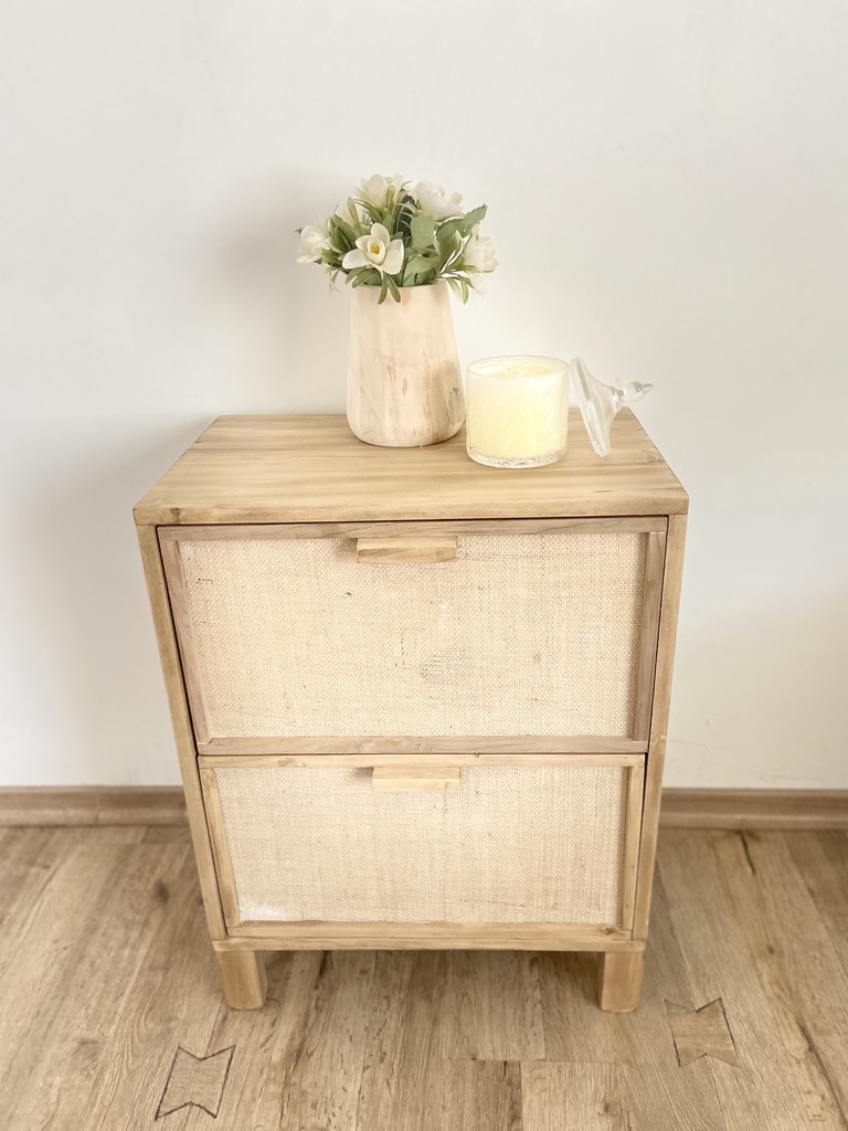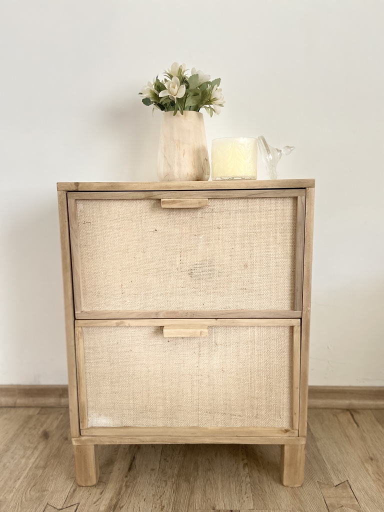 Material: Madera maciza teñida color simil petiribi, forrada con fibras naturales off white. Esta elegante mesa de luz cuenta con dos cajones que ofrecen un espacio adicional para organizar tus objetos personales.
