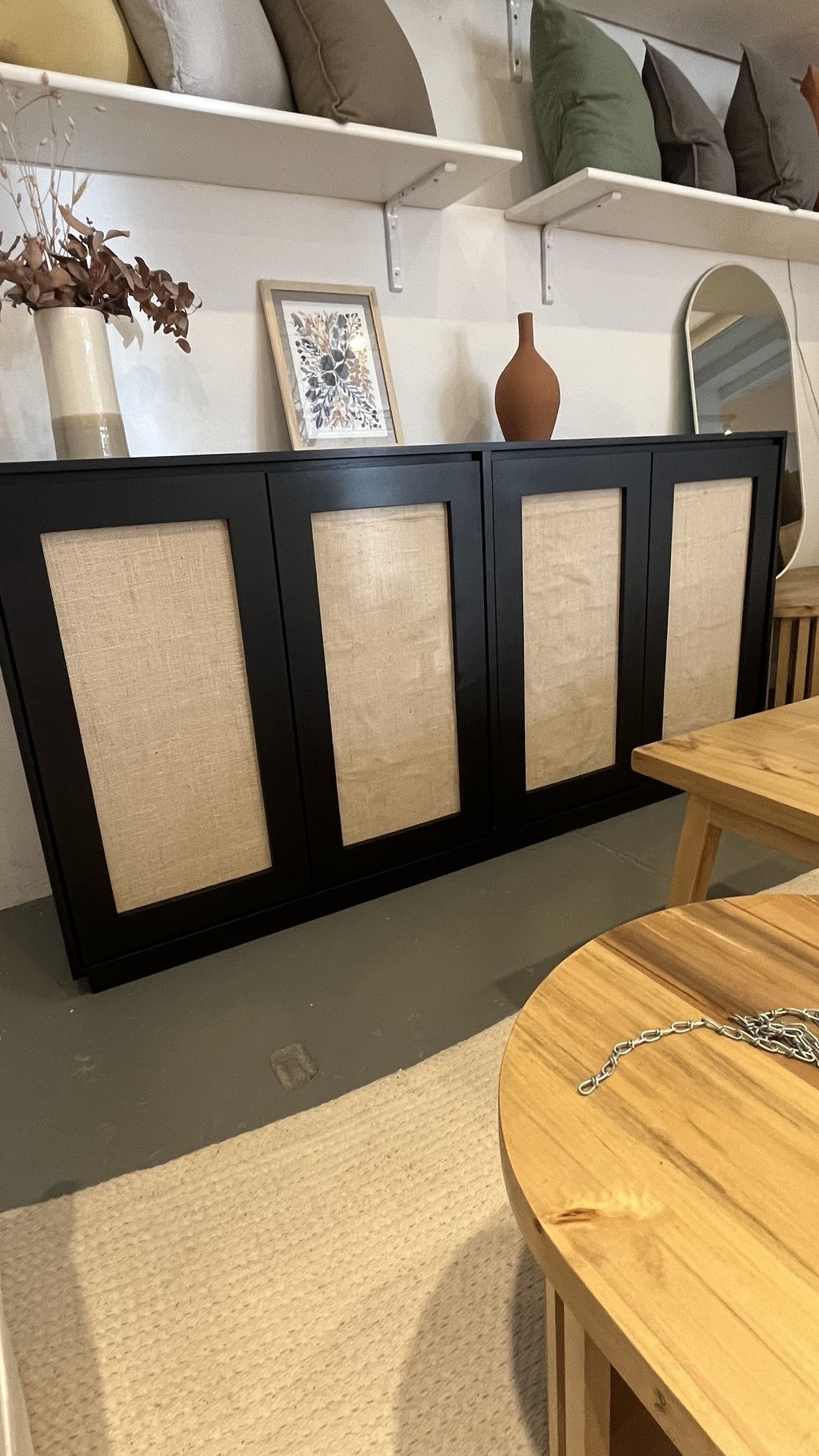 Material: Madera MDD laqueada en dos tonos, negro y blanco, con 4 puertas enteladas en fibras naturales.